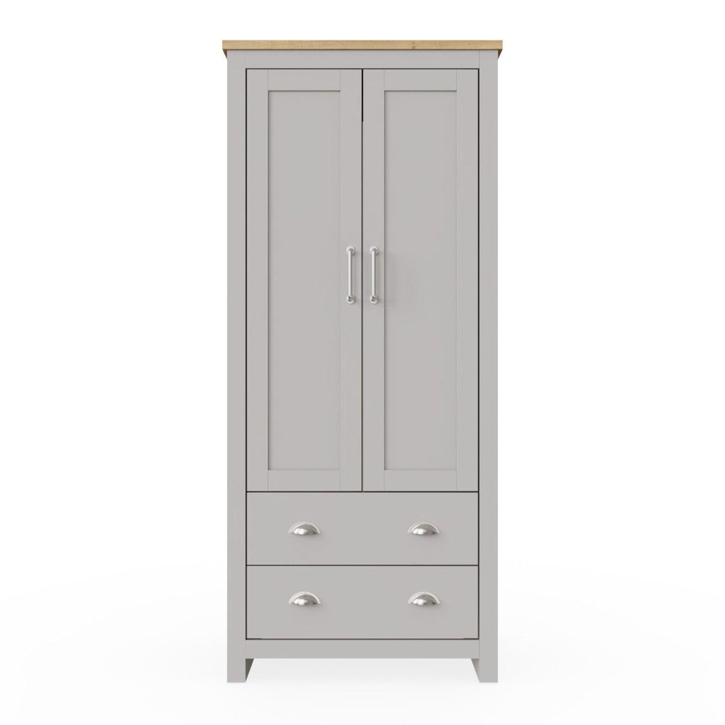 Full of presence, the Lisbon range in Light Grey and cascading Oak tops fills any room with warmth and comfort. The Lisbon wardrobe is completed with a hanging rail and 2 spacious drawers providing an effective storage mix.