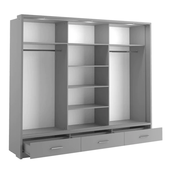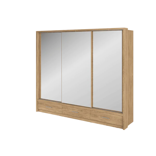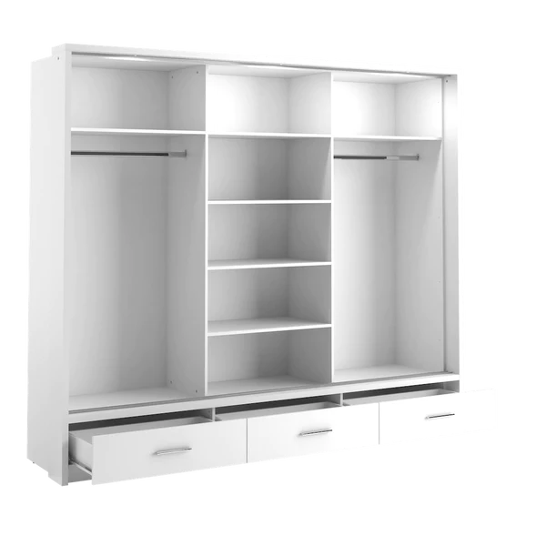The wardrobe is in three sections with two hanging areas and shelves down the middle for folded clothes. Across the bottom, there are three drawers which can be used in limited bedroom space, instead of having an additional chest of drawers. Where space is limited and appearance is essential, a sliding door wardrobe is a perfect solution for any room.