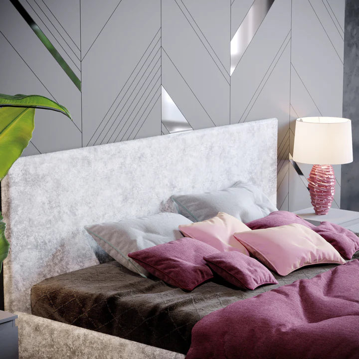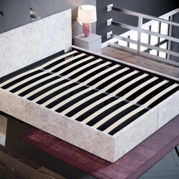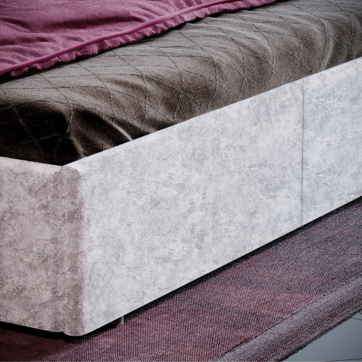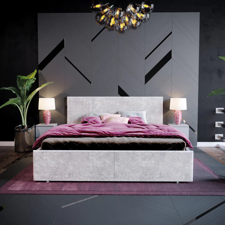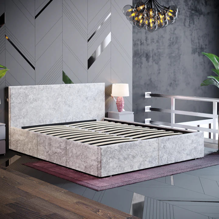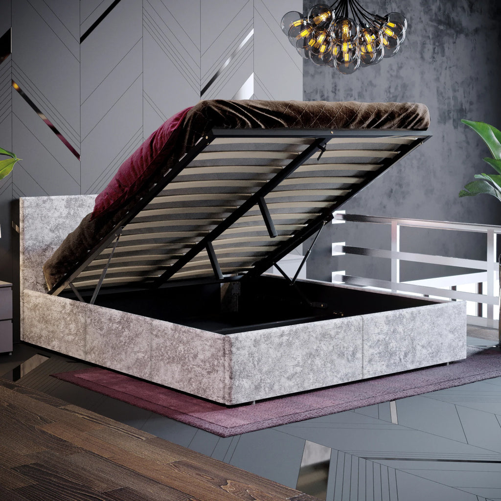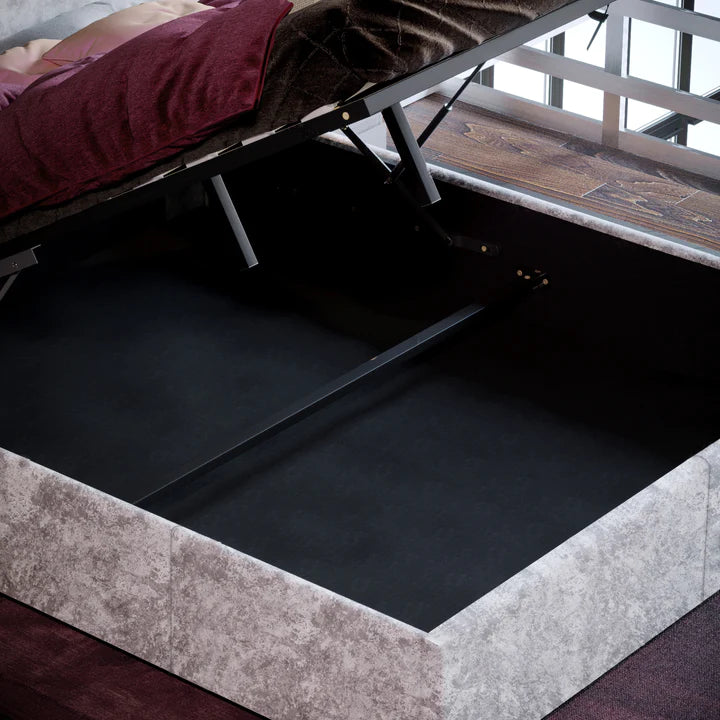 Muvazzi King Size Ottoman Faux Leather Bed in Silver velvet With Large Underbed Storage & Headboard