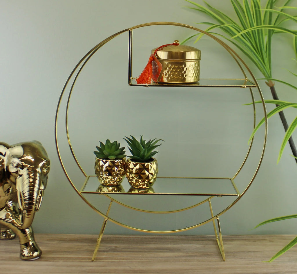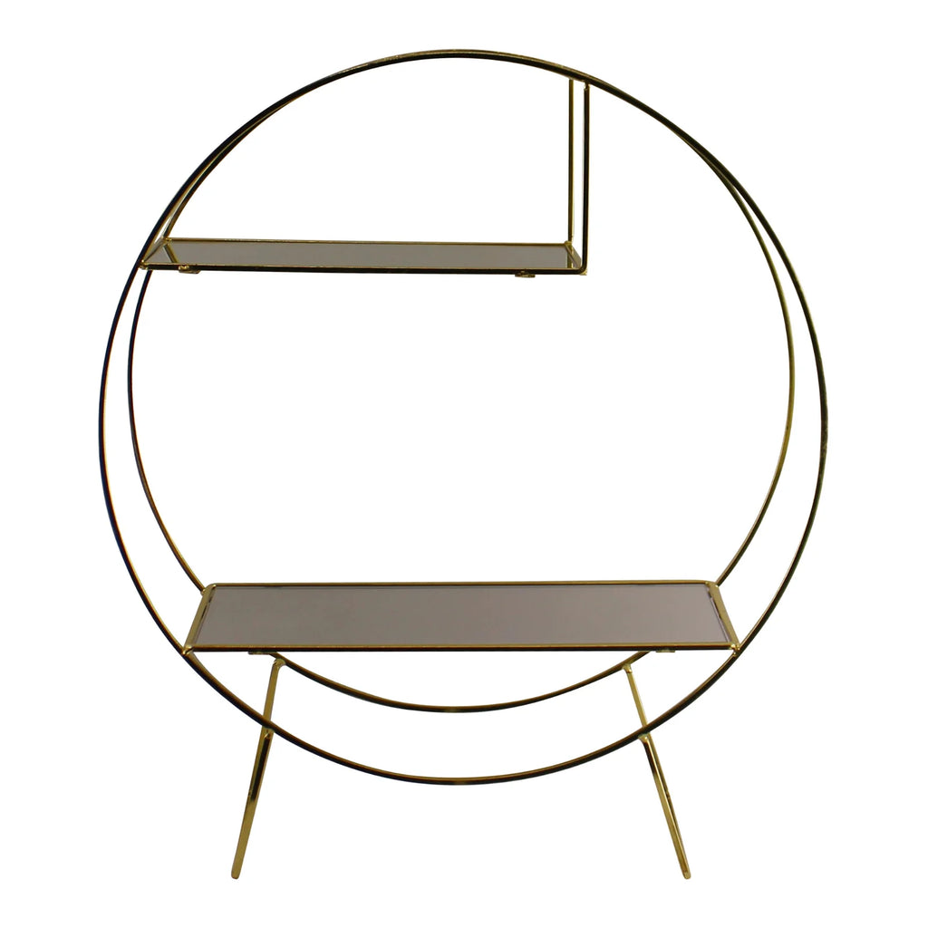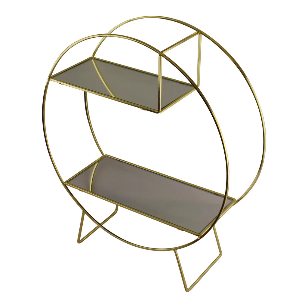 A beautiful piece of freestanding display shelving, perfect for a bedroom or living room to display treasured ornaments. The unit is made of iron with mirrored glass for the shelves. Shelf sizes; top shelf W24 D13 H10cm, bottom shelf W30 D13 H20cm. Measurements: 12.5 x 46 x 40cm SKU: WF2453