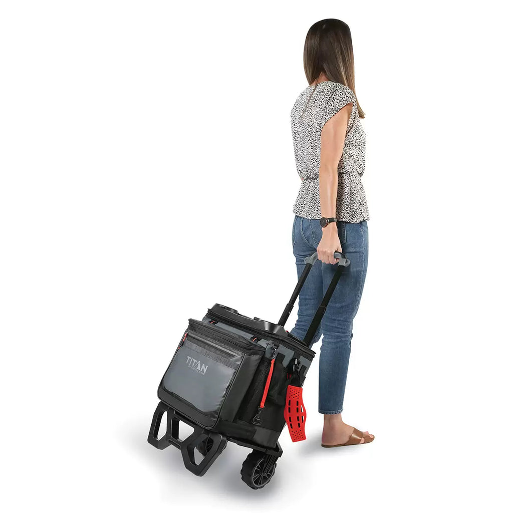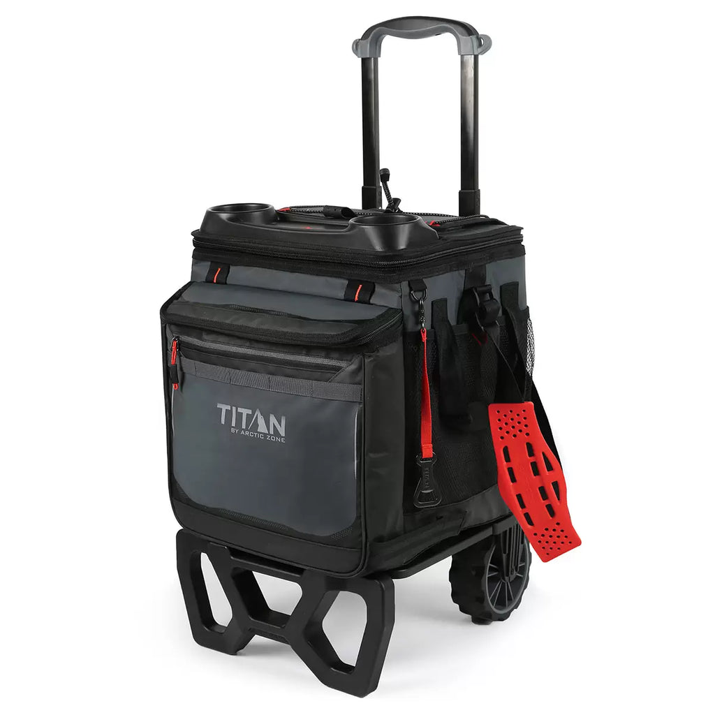 This Titan 22.5 Litre (23.7 US Quart) 60 Can Rolling Cooler holds ice up to 3 days! The interior is comprised of DeepFreeze™ high performance insulation with radiant heat barrier and triple layer Cold Block™ base for superior cooling and features a seamless, Ultra Safe® leak proof liner that is removable for easy cleaning. The cooler’s exterior is constructed of durable, water and stain resistant and includes an easy access lid, expandable insulated front compartment, 2 drink holders and a detachable bottle opener.