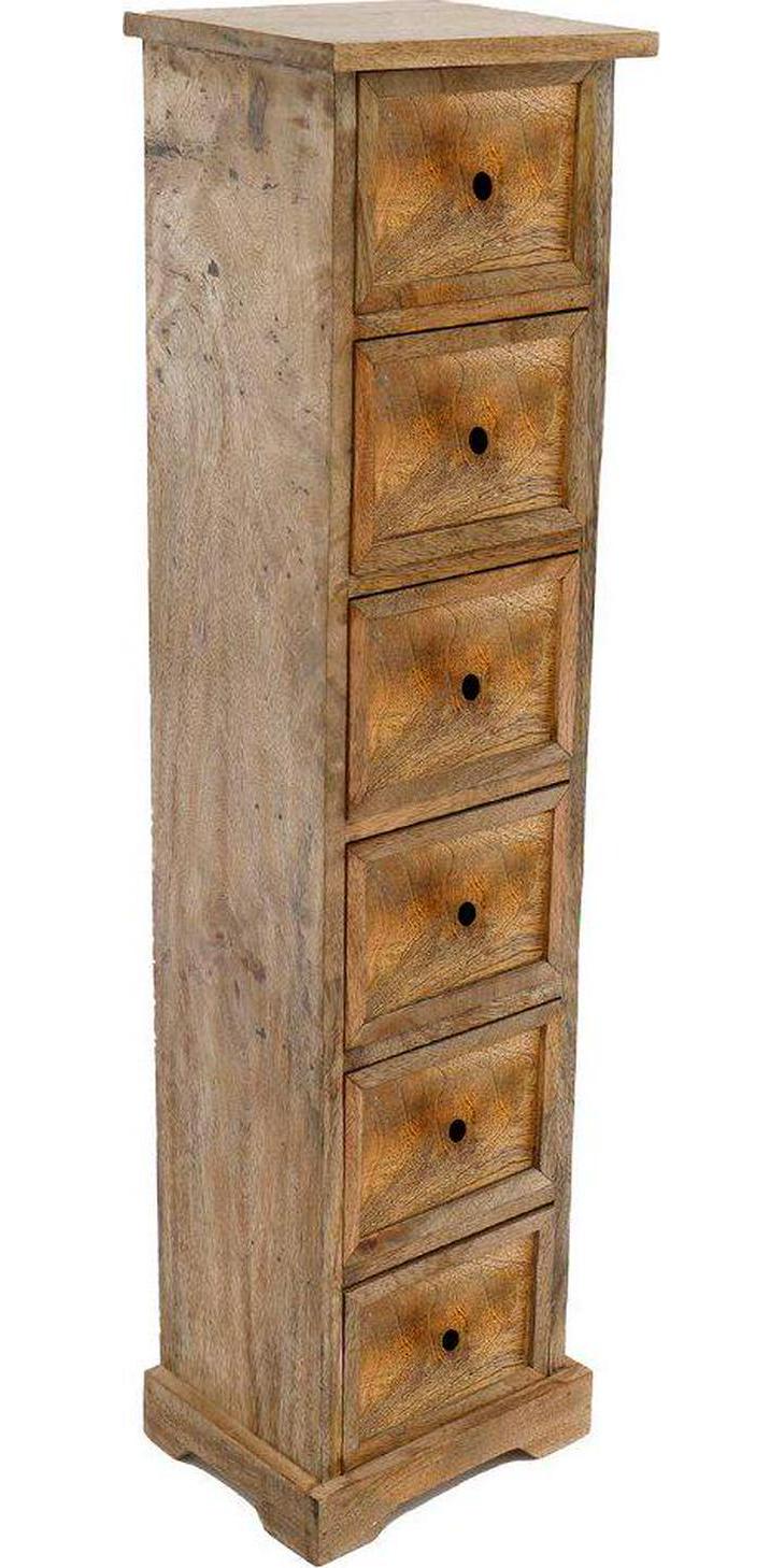 Wooden Cabinet With Six Drawers This mango wood set of six drawers is a neat and elegant piece. The drawer knobs are NOT included but are available to purchase separately. Mango wooden drawers. Each of the six drawers have internal dimensions of 15.5x13x11.3cm. The overall measurements are: D22 x H92.5 x W24cm SKU: WF2473