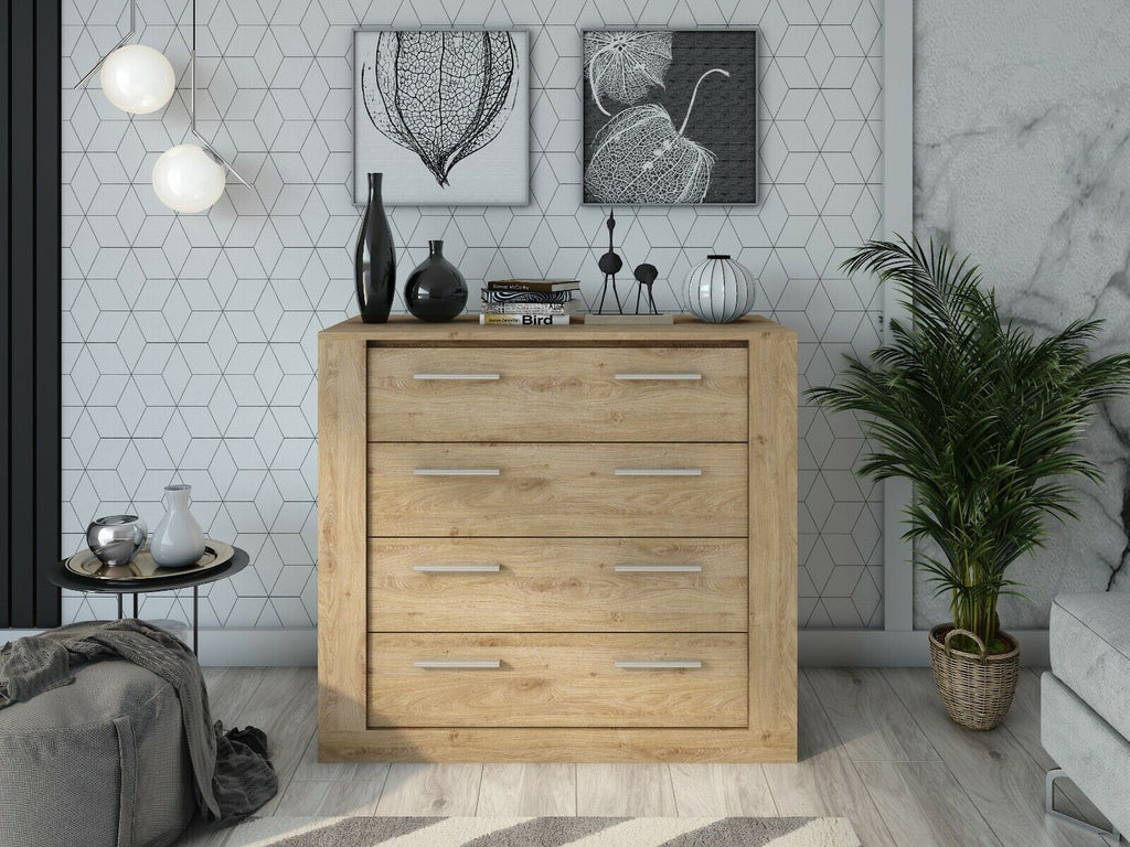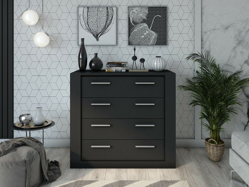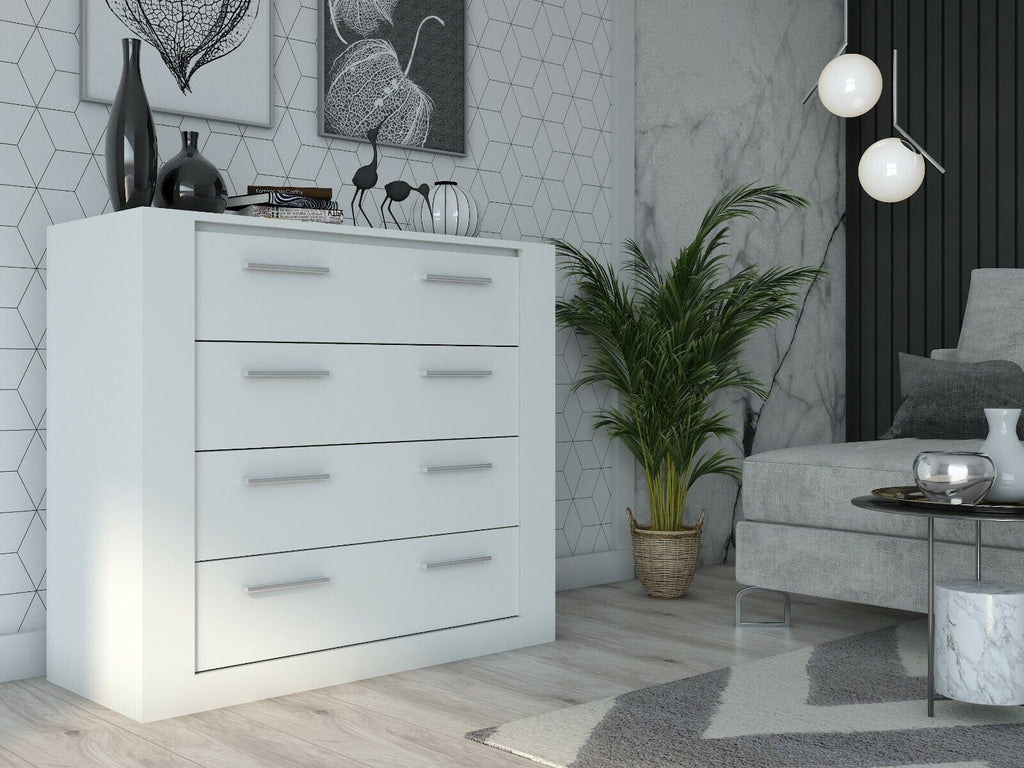 This clean-cut chest of drawers will give any room a contemporary touch and provide extra storage space. Made from high-quality 16mm laminated board, it features four spacious drawers, sleek handles and soft closing hinges. Thanks to its functional and modern design, this chest is easy to match with any interior decor.