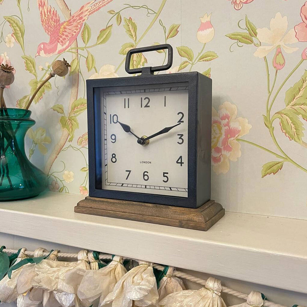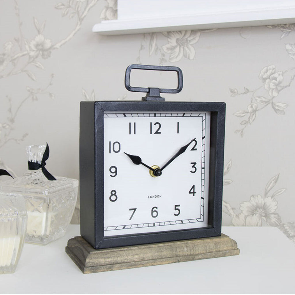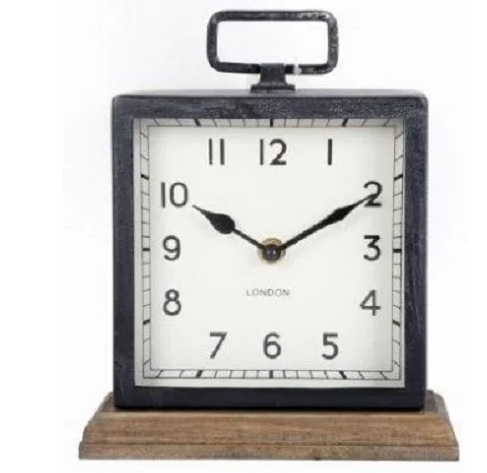 Manufactured from Metal with a black frame around the face, standing on a wooden base, this clock is sure to add a modern touch to any home or office decor.