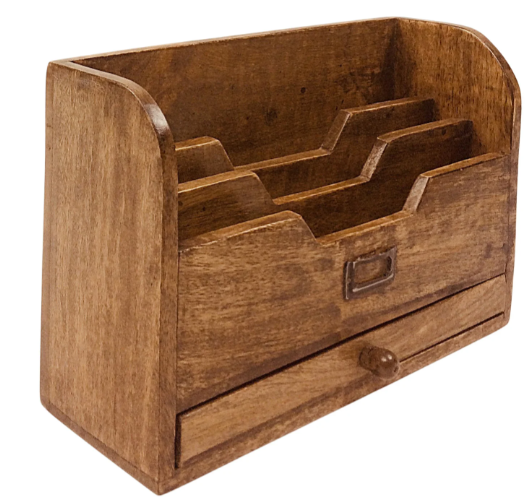 Free-standing varnished mango wood letter rack with drawer and metal nameplate. The nameplate card insert size is 35 x 17mm with a display area of 32 x 12mm (not included). The overall size is 31cm wide, 11cm deep and 20cm heigh. The 3 letter compartments openings are 28 x 2cm The internal drawer measurements are 7.5 x 26 x 2cm.